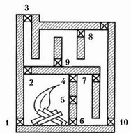 Рис. 136. Макетная схема печи с задвижками (пронумерованными цифрами), меняющими режимы работы полостей и каналов.